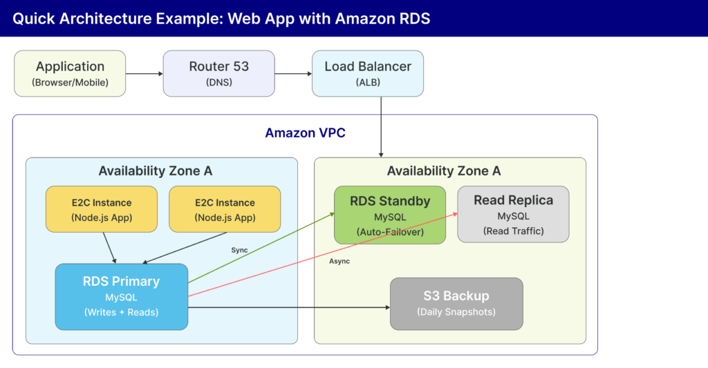 Here is how a typical Node.js online store would use RDS. Users visit the site, Route 53 (DNS) directs them to a Load Balancer, which splits traffic across two EC2 instances. The app reads and writes to an RDS MySQL primary in Availability Zone A. A standby in Zone B takes over if the primary fails. A read replica handles product listing traffic, and RDS stores daily snapshots in S3.
